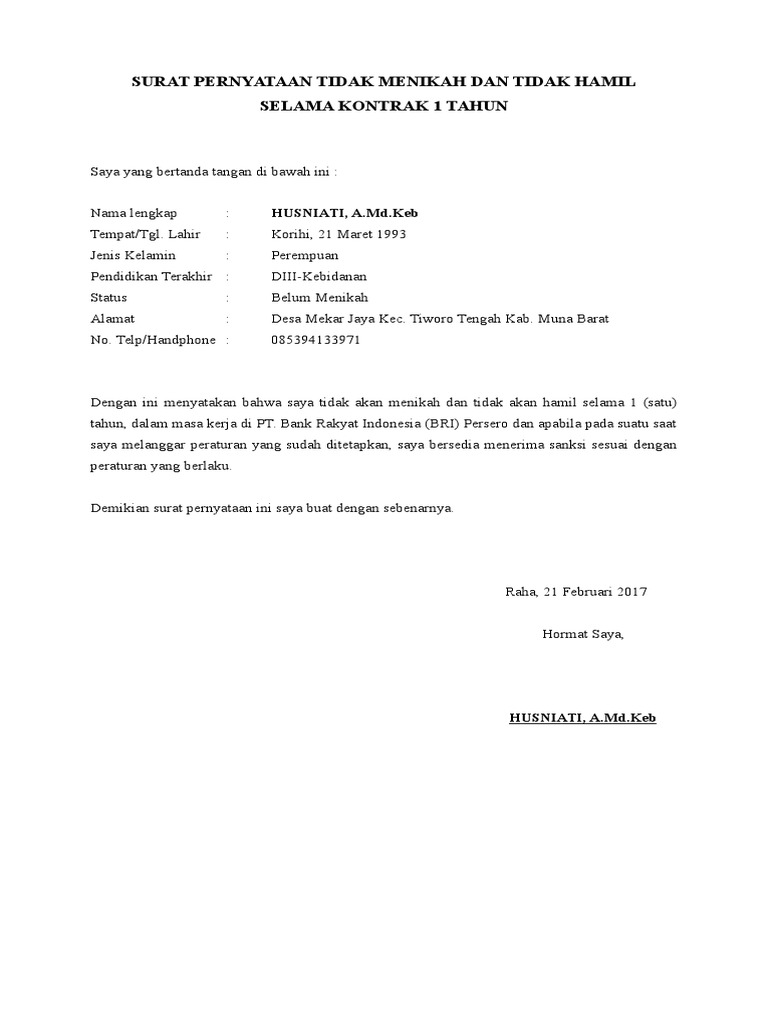 Surat Pernyataan Tidak Akan Menikah Selama Magang Di Bri / Surat Pernyataan Tidak Menikah